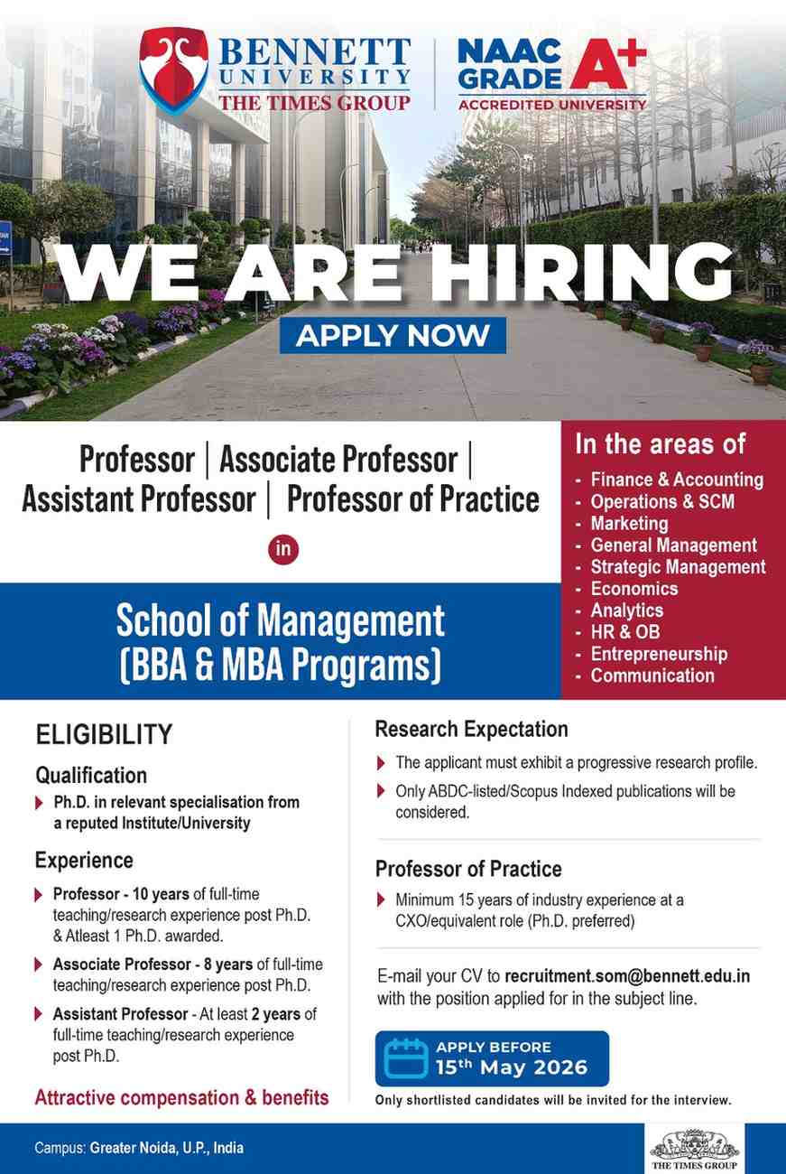 E-mail your CV to recruitment.som@bennett.edu.in with the position applied for in the subject line.