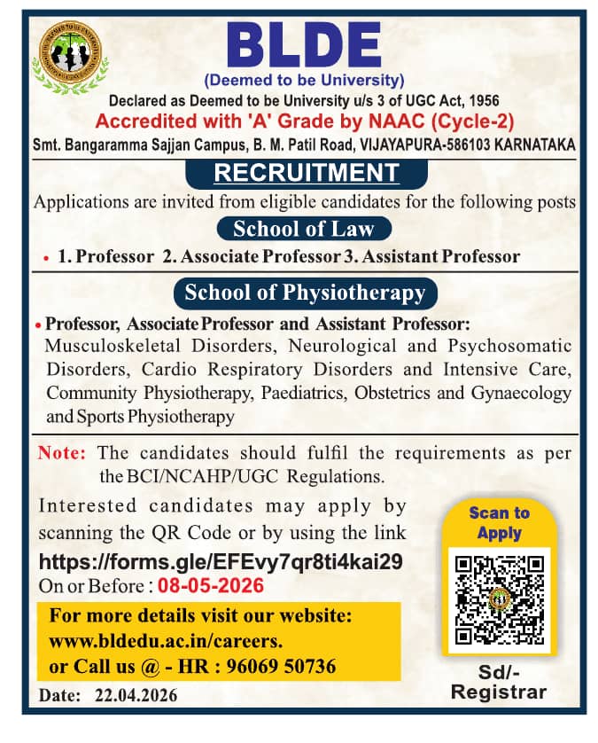 BLDE (Deemed to be University) Vijayapura, Karnataka has announced a job notification for the academic year 2026–2027. The institution invites applications from qualified and experienced candidates for Professor, Associate Professor, and Assistant Professor positions in various disciplines. Candidates with Good Academic Record are eligible to apply. Interested candidates can apply via Online by submitting required documents before the deadline.