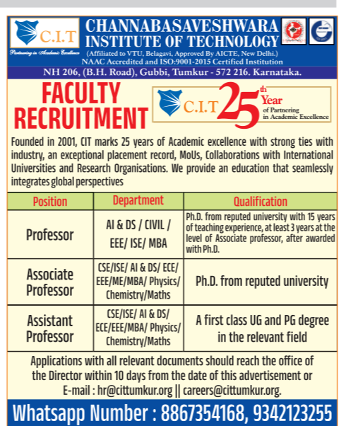 Channabasaveshwara Institute of Technology , Tumkur has announced a job notification for the academic year 2026–2027. The institution invites applications from qualified and experienced candidates for Professor, Associate Professor, and Assistant Professor positions in various disciplines. Candidates with Good Academic Record are eligible to apply. Interested candidates can apply via Email/ Postal by submitting required documents before the deadline.