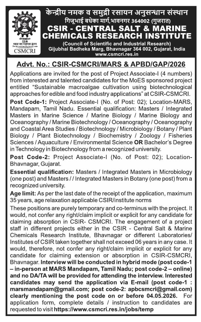 Interview will be conducted in hybrid mode (post code-1 – in-person at MARS Mandapam, Tamil Nadu; post code-2 – online) and no DATA will be provided for attending the interview. Interested candidates may send the application via E-mail (post code-1 marsmandapam@gmail.com; post code-2: apbcsmcri@gmail.com) clearly mentioning the post code on or before 04.05.2026.