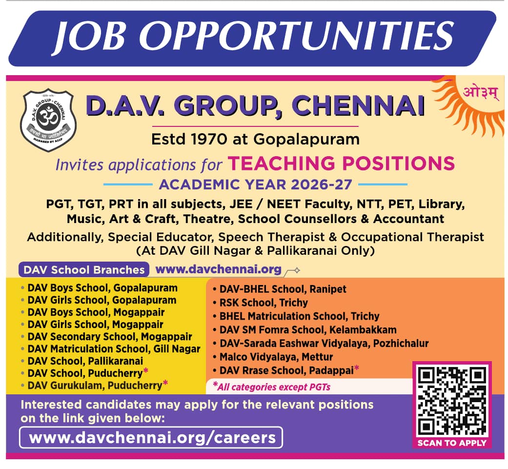 - Special Educator, Speech Therapist & Occupational Therapist (At DAV Gill Nagar & Pallikaranai Only)