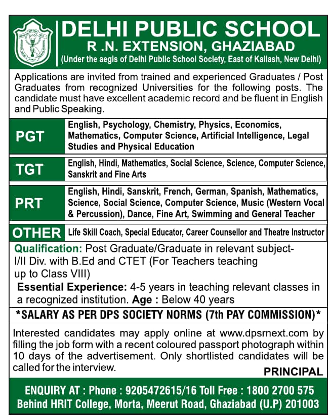 Salary: As per DPS Society Norms(7th Pay Commission)