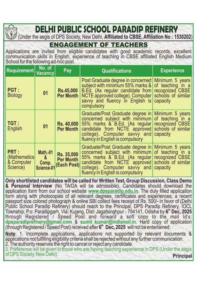 How to Apply: Candidates should download the application form from our school website www.dpsparadip.edu.in. The duly filled application form along with photocopies of all relevant degrees, certificates and experiences, a recent passport size colored photograph & online SBI collect fees receipt of Rs. 500/- in favor of (Delhi Public School Paradip Refinery) should reach to the Principal, DPS Paradip Refinery, IOCL Township, P.o: Paradipgarh, Via: Kujang, Dist: Jagatsinghpur – 754141, Odisha by 6th Dec, 2025 through Registered / Speed Post and forward a soft copy to the mail Id’s: dpsparadiprefinery@gmail.com & sumit_kumar@indianoil.in. Hard copy of application (through Registered / Speed Post) received after 6th Dec, 2025 will not be entertained.