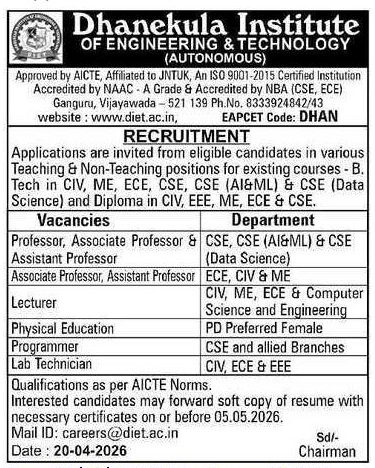 Dhanekula Institute of Engineering & Technology, Vijayawada, Andhra Pradesh has announced a job notification for the academic year 2026–2027. The institution invites applications from qualified and experienced candidates for Professor, Associate Professor, and Assistant Professor positions in various engineering disciplines. Candidates with Good Academic Record are eligible to apply. Interested candidates can apply via Email by submitting required documents before the deadline.