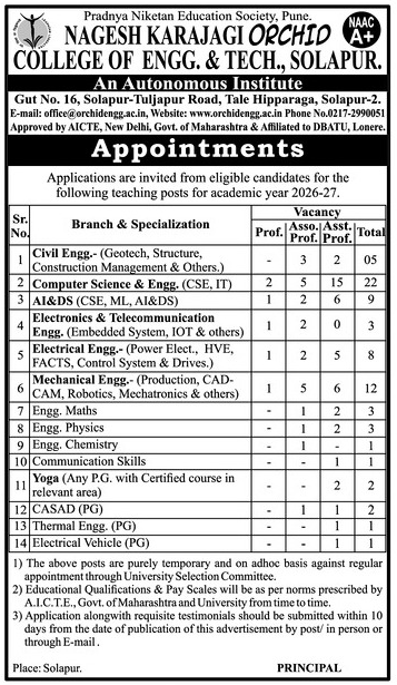 N.K.Orchid College of Engineering and Technology, Solapur has announced a job notification for the academic year 2026–2027. The institution invites applications from qualified and experienced candidates for Professor, Associate Professor, and Assistant Professor positions in various engineering disciplines. Candidates with Good Academic Record are eligible to apply. Interested candidates can apply via Email/ Postal by submitting required documents before the deadline.