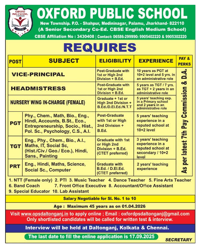 Faculty Recruitment 2025 job notification announced by Oxford Public School, Palamu , Jharkhand for the 2025-2026 academic year. Eligible candidates may apply through Online/Email