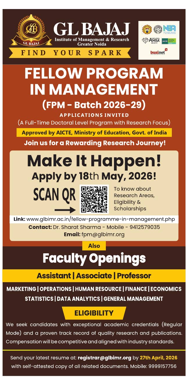 GL Bajaj Institute of Management and Research , Greater Noida Wanted Assistant Professors/ Associate Professors & Professor for Various Department . Candidates with good academic record are eligible to apply. Interested candidates can apply via Email by submitting required documents before the deadline.
