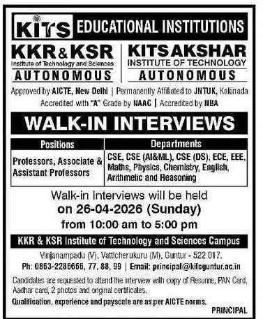 KITS Educational Institutions, Guntur has announced a job notification for the academic year 2026–2027. The institution invites applications from qualified and experienced candidates for Professor, Associate Professor, and Assistant Professor positions in various disciplines. Candidates with Good Academic Record are eligible to apply. Interested candidates can Walk-In