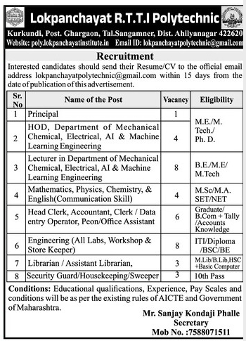 Lokpanchayat Rural Technical Training Institute Polytechnic , Ahilyanagar has announced a job notification for the academic year 2026–2027. The institution invites applications from qualified and experienced candidates for Teaching and Non-Teaching Faculty . Candidates with Good Academic Record are eligible to apply. Interested candidates can apply via Email by submitting required documents before the deadline.