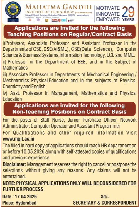 Mahatma Gandhi Institute of Technology, Hyderabad has announced a job notification for the academic year 2026–2027. The institution invites applications from qualified and experienced candidates for Professor, Associate Professor, and Assistant Professor positions in various disciplines. Candidates with Good Academic Record are eligible to apply. Interested candidates can apply via Postal by submitting required documents before the deadline.