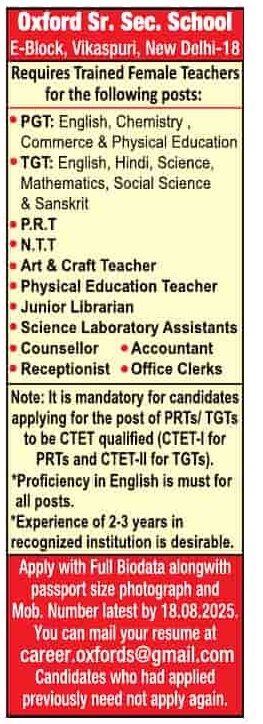Hiring Organization: Oxford Senior Secondary School, New Delhi