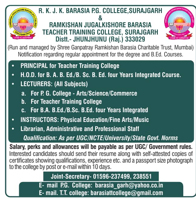 R.K.J.K. Barasia P.G College, Surajgarh and Ramkishan Jugalkishore Barasia Teacher Training college, Surajgarh has announced a job notification for the academic year 2026–2027. The institution invites applications from qualified and experienced candidates for Teaching Faculty positions . Candidates with Good Academic Record are eligible to apply. Interested candidates can apply via Email by submitting required documents before the deadline.
