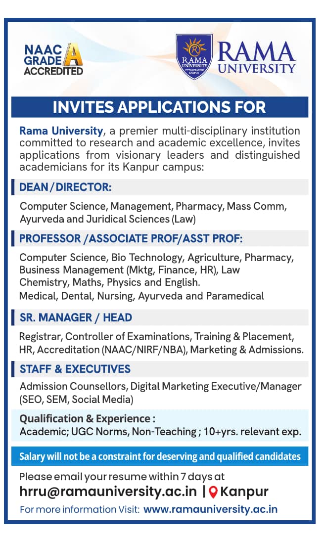 Rama University, Kanpur Wanted Professors/ Associate Professors/ Assistant Professors and Non-Teaching Faculty