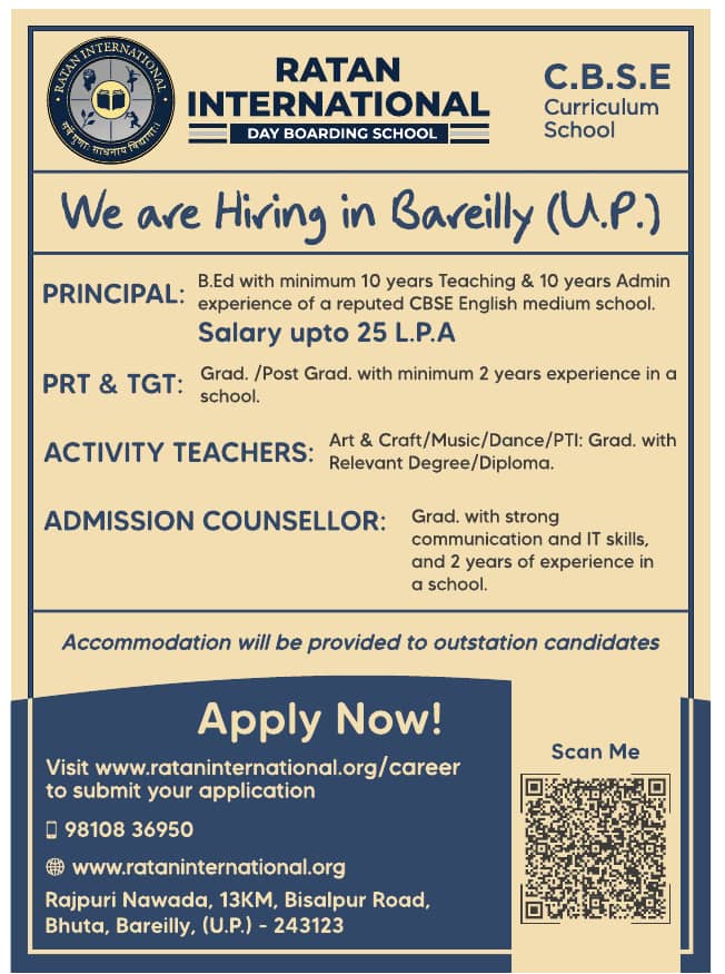 Faculty Recruitment 2025 notification announced by Ratan International School, Bareilly , Uttar Pradesh for the 2025-2026 academic year. Eligible candidates may apply through Online.