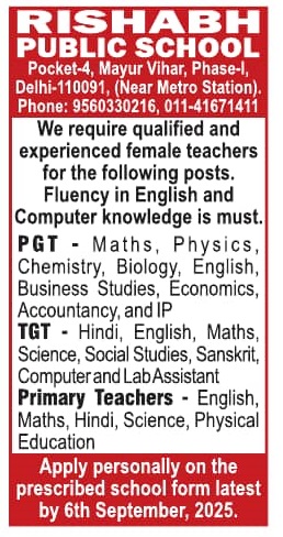 Faculty Recruitment 2025 job notification announced by Rishabh Public School, Delhi for the 2025-2026 academic year. Eligible candidates may apply