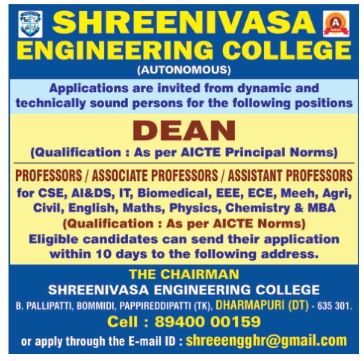 Shreenivasa Engineering College Wanted Assistant Professors/ Associate Professors & Professor for Various Department and requires Dean. Candidates As Per AICTE Norms are eligible to apply. Interested candidates can apply via Postal by submitting required documents before the deadline.