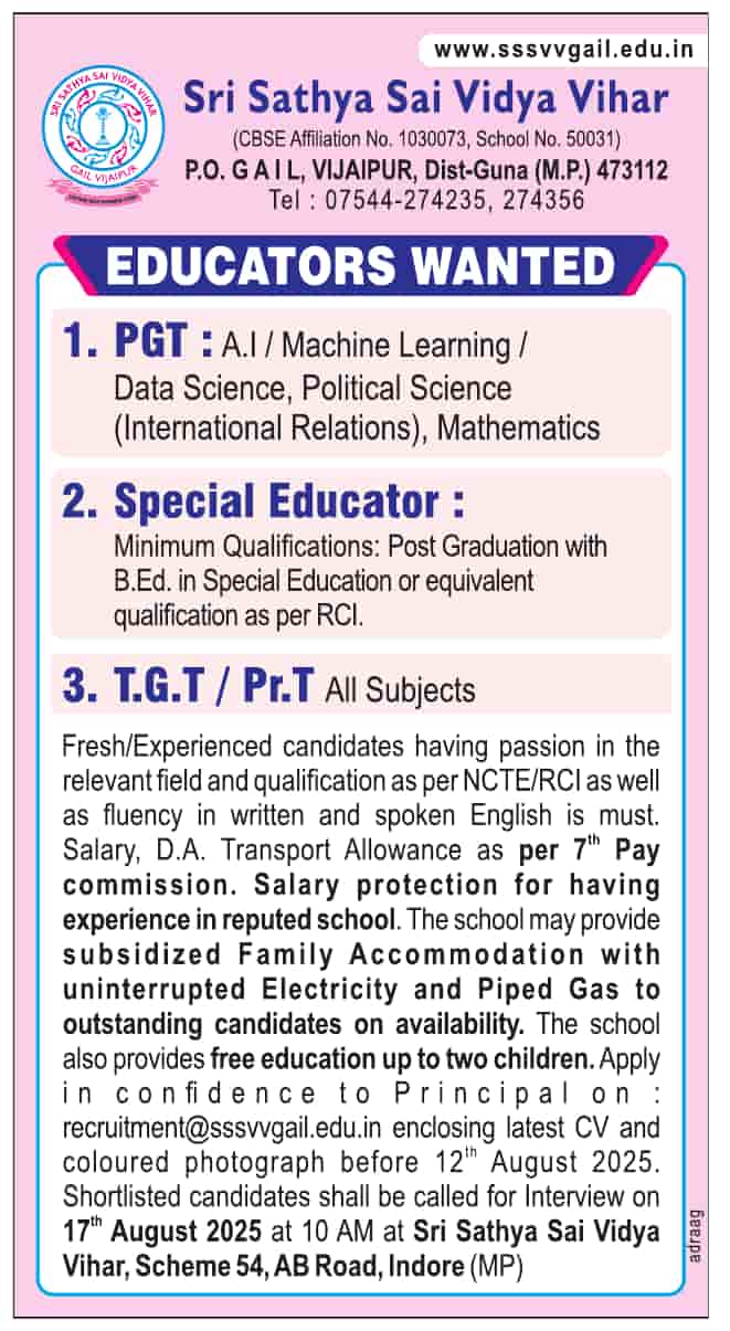 Note: Shortlisted candidates shall be called for Interview on 17th August 2025 at 10 AM at Sri Sathya Sai Vidya Vihar, Scheme 54, AB Road, Indore (MP)