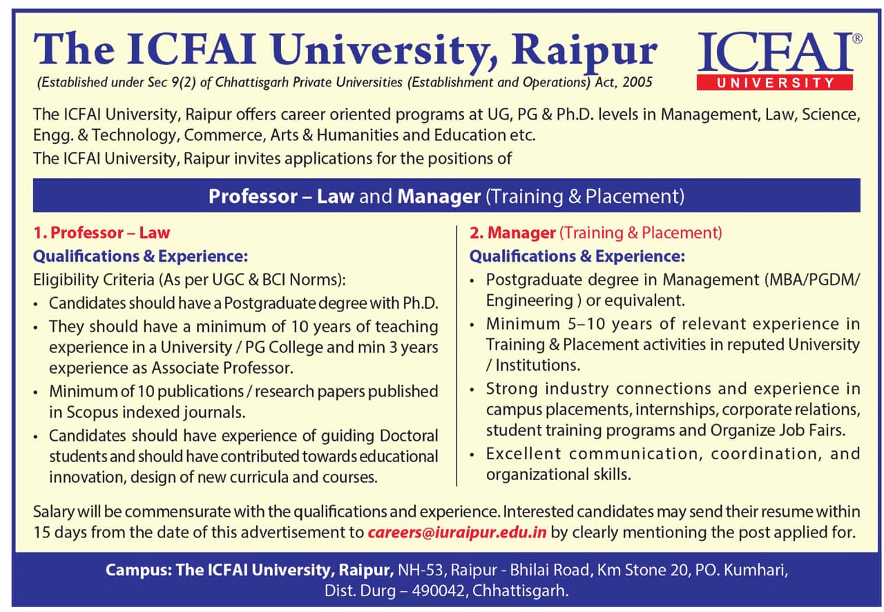 The ICFAI University, Raipur wanted Professor for the Department of Law and Manager. Candidates As Per UGC/ BCI Norms are eligible to apply. Interested candidates can apply via Email by submitting required documents before the deadline.