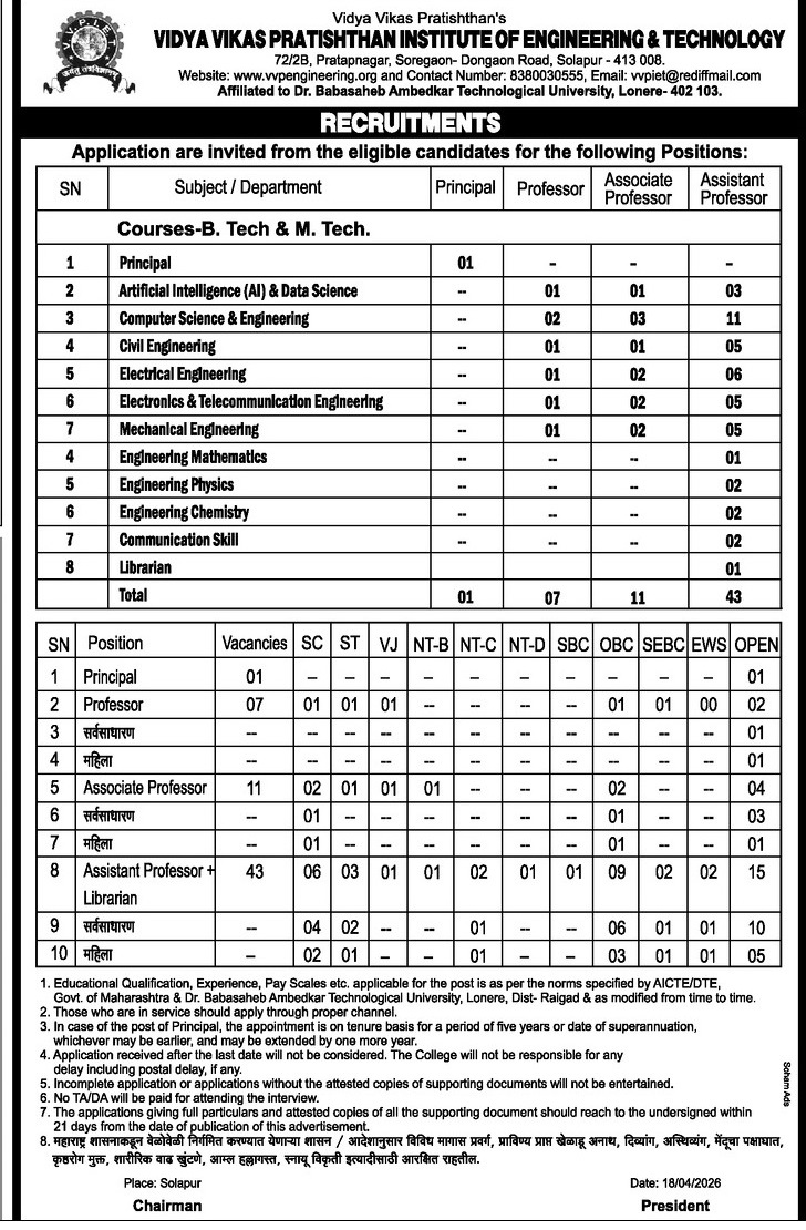 V V P Institute of Engineering and Technology, Solapur has announced a job notification for the academic year 2026–2027. The institution invites applications from qualified and experienced candidates for Professor, Associate Professor, and Assistant Professor positions in various engineering disciplines. Candidates with Good Academic Record are eligible to apply. Interested candidates can apply via Postal by submitting required documents before the deadline.