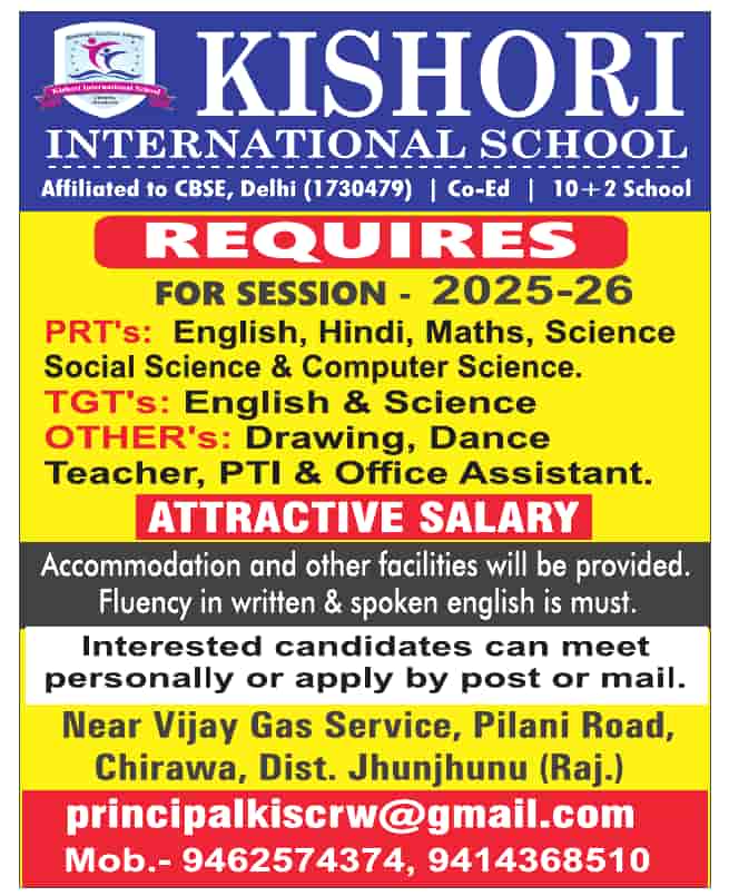 Faculty Recruitment 2025 job notification announced by Kishori International School, Jhunjhunu, Rajasthan for the 2025-2026 academic year. Eligible candidates may apply through Email/Postal.
