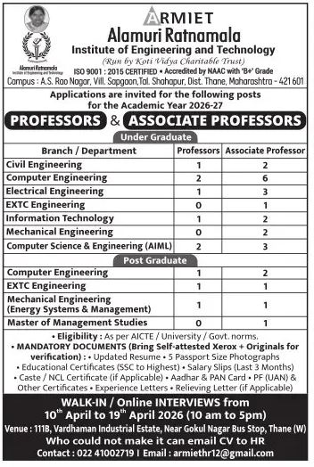 Alamuri Ratnamala Institute of Engineering and Technology (ARMIET), Thane, invites applications from qualified and dynamic professionals for faculty positions in engineering disciplines. The institution is seeking Professor, Associate Professor candidates for its engineering programs. Applicants with strong academic backgrounds, research orientation, and industry exposure are encouraged to apply. Opportunities are available across multiple engineering branches and management specializations. With competitive salary packages and a focus on innovation, research, and industry collaboration, this is an excellent opportunity for academicians to advance their careers in a growing engineering institution in Maharashtra.