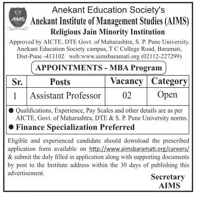 Anekant Institute of Management Studies (AIMS), Pune Wanted Assistant Professor. Candidates As Per AICTE, Govt of Maharashtra DTE & S.P.P. University Norms are eligible to apply. Interested candidates can apply via Postal by submitting required documents before the deadline.