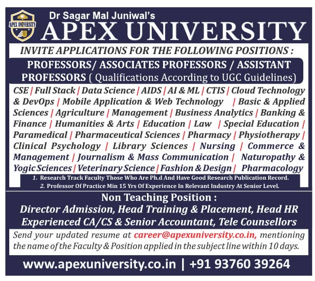 Apex University, Jaipur has announced a job notification for the academic year 2026–2027. The institution invites applications from qualified and experienced candidates for Professor, Associate Professor, and Assistant Professor positions in various disciplines. Candidates with Good Academic Record are eligible to apply. Interested candidates can apply via Email by submitting required documents before the deadline.