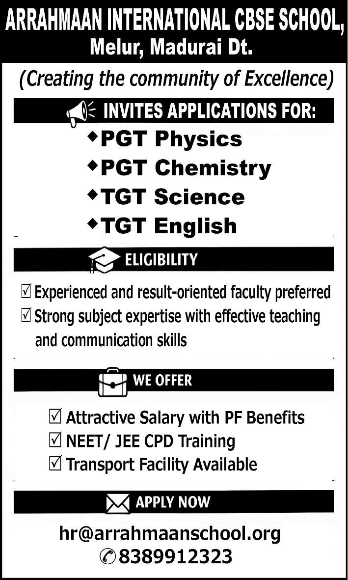 Arrahmaan International School, Melur, Madurai has announced a job notification for the academic year 2026–2027. The institution invites applications from qualified and experienced candidates for Teachers for various disciplines. Candidates with Good Academic Record are eligible to apply. Interested candidates can apply via Email by submitting required documents before the deadline.
