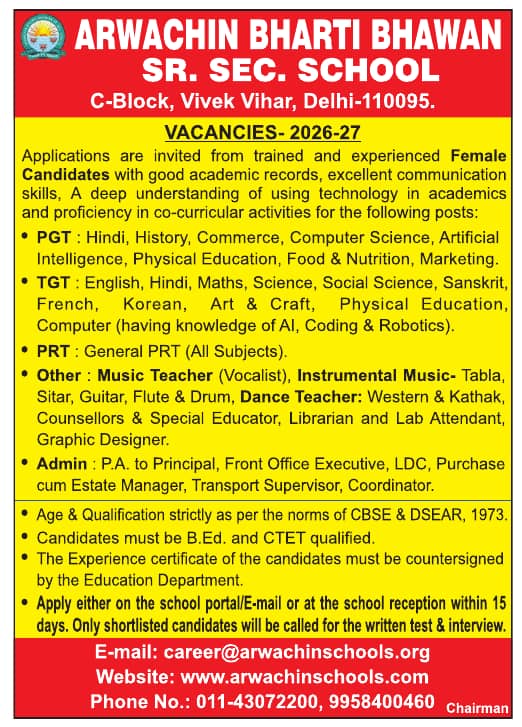 Faculty Recruitment job notification announced by Arwachin Bharti Bhawan Senior Secondary School, Delhi for the Academic year 2026-2027. Eligible candidates may Email/Online
