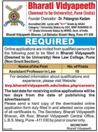 Bharati Vidyapeeth (Deemed to be University), Pune Wanted Assistant Professor