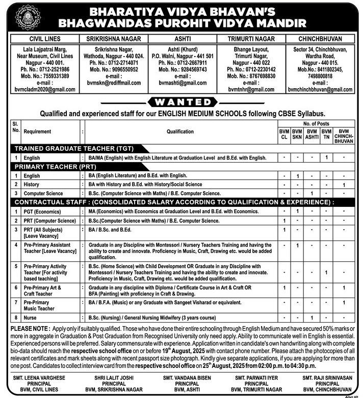 Hiring Organization: Bharatiya Vidya Bhavan’s Bhagwandas Purohit Vidya Mandir, Nagpur