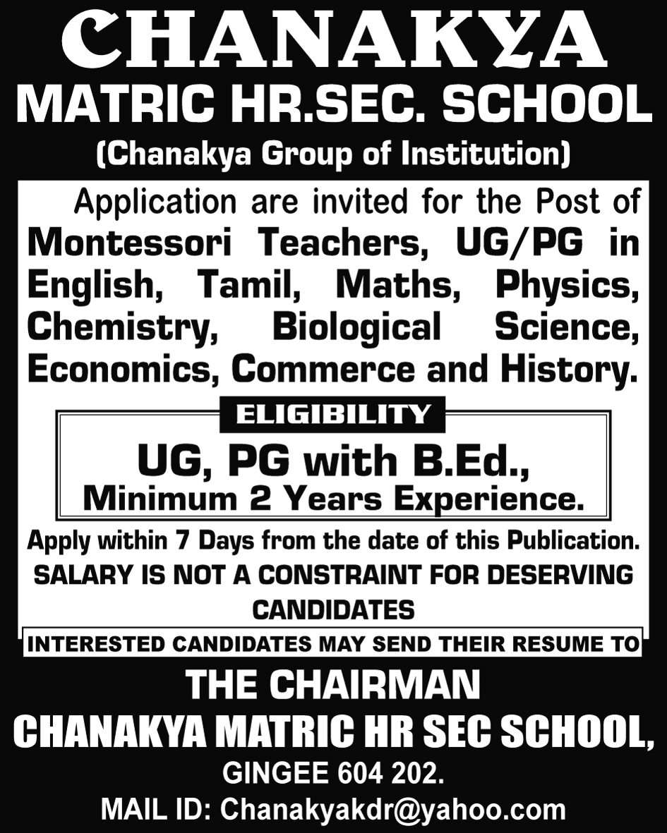 Chanakya Matriculation Higher Secondary School, Gingee has announced a job notification for the academic year 2026–2027. The institution invites applications from qualified and experienced candidates for Teachers for various disciplines. Candidates with Good Academic Record are eligible to apply. Interested candidates can apply via Email/ Postal by submitting required documents before the deadline.