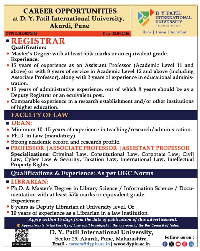 D Y Patil International University (DYPIU), Akurdi, Pune has announced a job notification for the academic year 2026–2027. The institution invites applications from qualified and experienced candidates for Professor, Associate Professor, and Assistant Professor positions. Candidates with Good Academic Record are eligible to apply. Interested candidates can apply via Email/ Online by submitting required documents before the deadline.