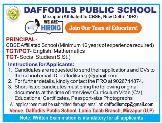 Faculty Recruitment 2025 job notification announced by Daffodils Public School, Mirzapur, Uttar Pradesh for the 2025-2026 academic year. Eligible candidates may apply through Email