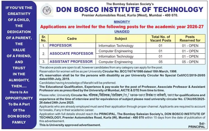 Don Bosco Institute Of Technology, Mumbai wanted Professor / Associate Professor / Assistant Professor for Various Department . Candidates with Good Academic Record are eligible to apply. Interested candidates can apply via Postal by submitting required documents before the deadline.