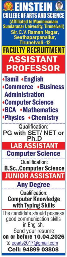 Einstein College of Arts and Science, Tirunelveli wanted Teaching and Non-Teaching Faculty . Candidates with Master Degree and Ph.D are eligible to apply . Interested candidates can apply via Email by submitting required documents before the deadline.