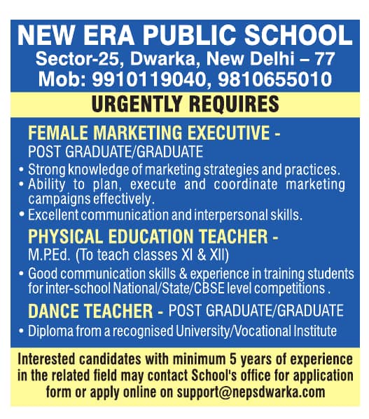 Faculty Recruitment 2025 job notification announced by New Era Public School, Dwarka for the 2025-2026 academic year. Eligible candidates may apply through Online/Email