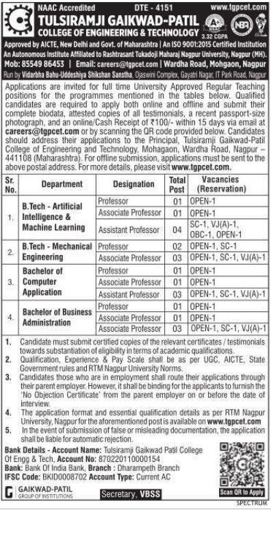 Tulsiramji Gaikwad – Patil College of Engineering & Technology, Wardha Road, Mohgaon, Nagpur wanted Assistant Professors/ Associate Professors & Professor . Candidates with good academic record are eligible to apply. Interested candidates can apply via Postal and Email by submitting required documents before the deadline.