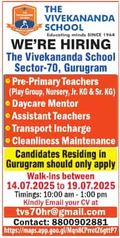 Faculty Recruitment 2025 job notification announced by The Vivekananda School, Gurugram, Haryana for the 2025-2026 academic year. Eligible candidates may apply through Email/Walk-in.