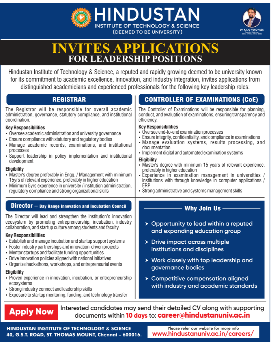 Email to Apply career@hindustanuniv.ac.in