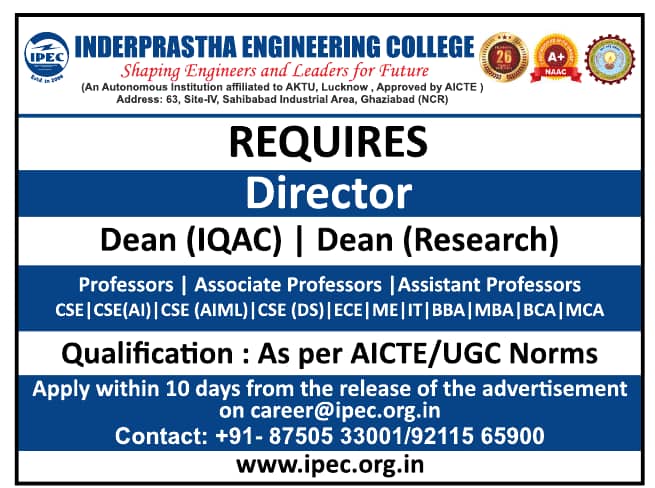 Inderprastha Engineering College, Ghaziabad has announced a job notification for the academic year 2026–2027. The institution invites applications from qualified and experienced candidates for Professor, Associate Professor, and Assistant Professor positions in various disciplines. Candidates with Good Academic Record are eligible to apply. Interested candidates can apply via Email by submitting required documents before the deadline.