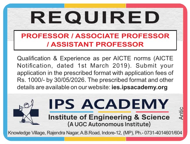 IPS Academy, Indore has announced a job notification for the academic year 2026–2027. The institution invites applications from qualified and experienced candidates for Professor, Associate Professor, and Assistant Professor positions in various disciplines. Candidates with Good Academic Record are eligible to apply. Interested candidates can apply via Postal by submitting required documents before the deadline.