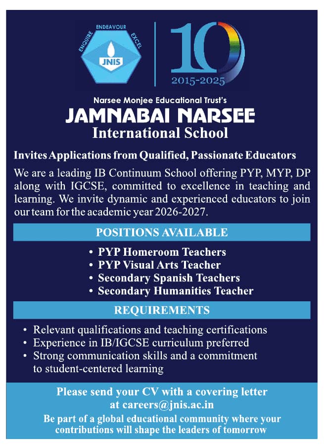 Faculty recruitment 2025 job vacancy notification announced by Jamnabai Narsee School, Mumbai, Maharashtra for the academic year 2026-2027. Eligible candidates may apply through Email.