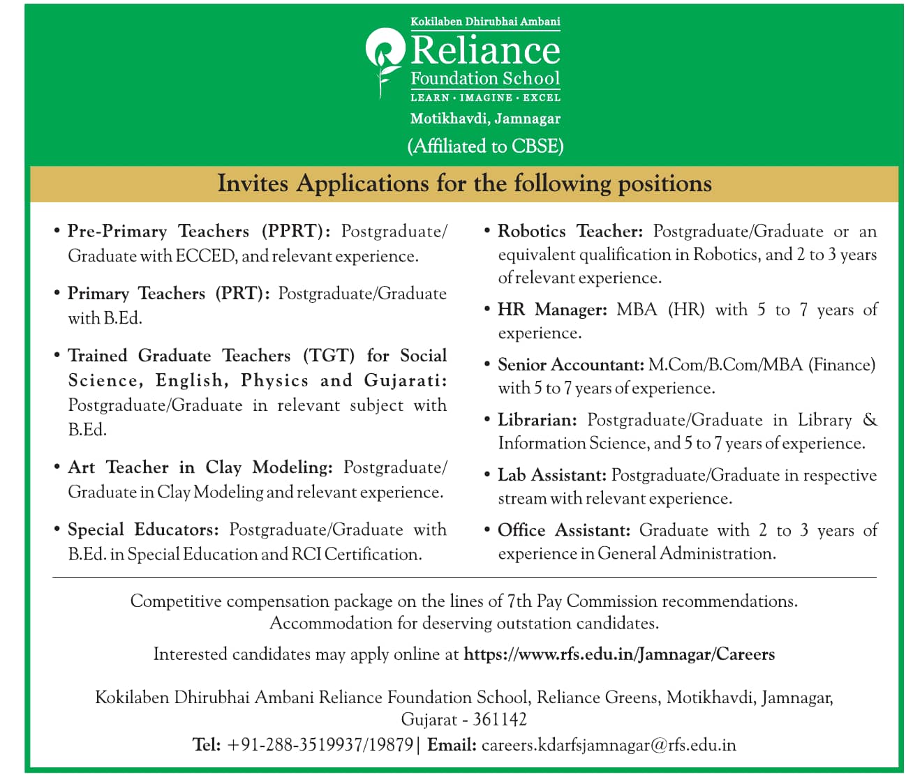 Hiring Organization: Kokilaben Dhirubhai Ambani Reliance Foundation School, Jamnagar