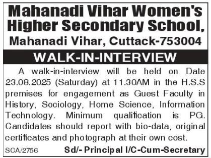 Faculty Recruitment 2025 job notification announced by Mahanadi Vihar Women’s Higher Secondary School, Cuttack, Odisha for the 2025-2026 academic year. Eligible candidates may attend the Walk-in interview .