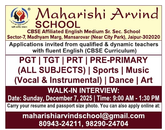 Faculty Recruitment job notification announced by Maharishi Arvind School, Jaipur for the post of PGT/TGT/PRT/Pre-Primary Teachers for the 2025-2026 academic year. Eligible candidates may apply by email.