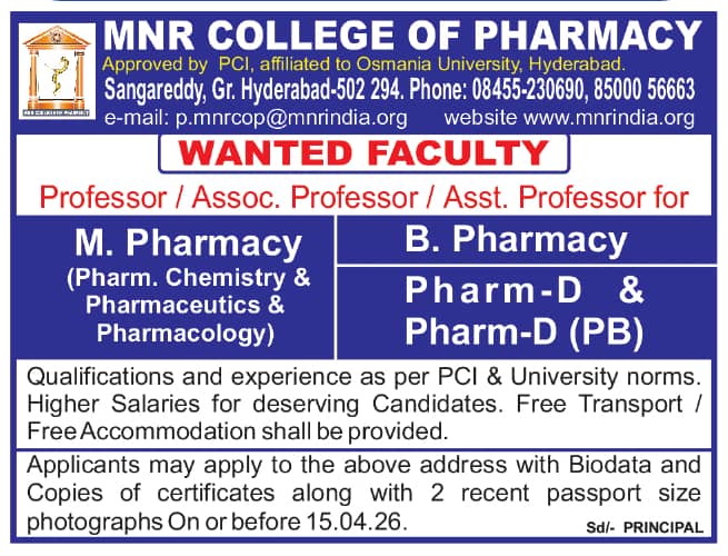 MNR College of Pharmacy, Hyderabad wanted Professor/ Associate Professor/ Assistant Professor