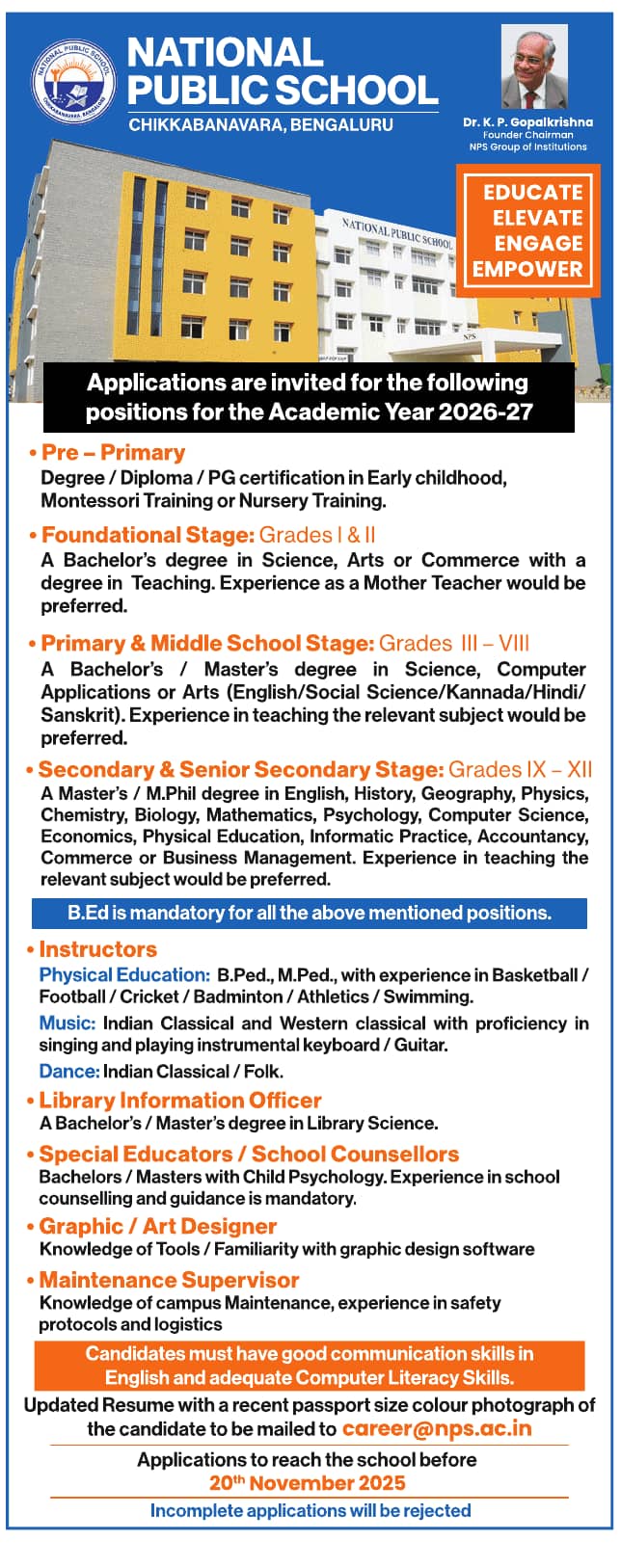 Faculty Recruitment job notification announced by National Public School, Bengaluru for the 2026-2027 academic year . Eligible candidates may apply through email.