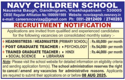 Faculty Recruitment 2025 job notification announced by Navy Children School, Visakhapatnam, Andhra Pradesh for the 2025-2026 academic year. Eligible candidates may apply through Email.