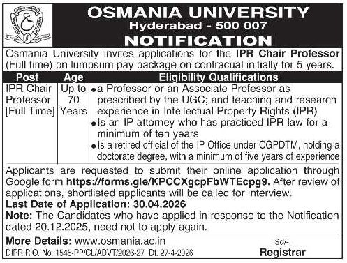 Osmania University Hyderabad, Telangana has announced a job notification for the academic year 2026–2027. The institution invites applications from qualified and experienced candidates for IPR Chair Professor positions . Candidates with Good Academic Record are eligible to apply. Interested candidates can apply via Online by submitting required documents before the deadline.